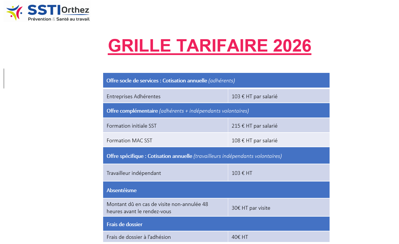 Grille tarifaire 2026